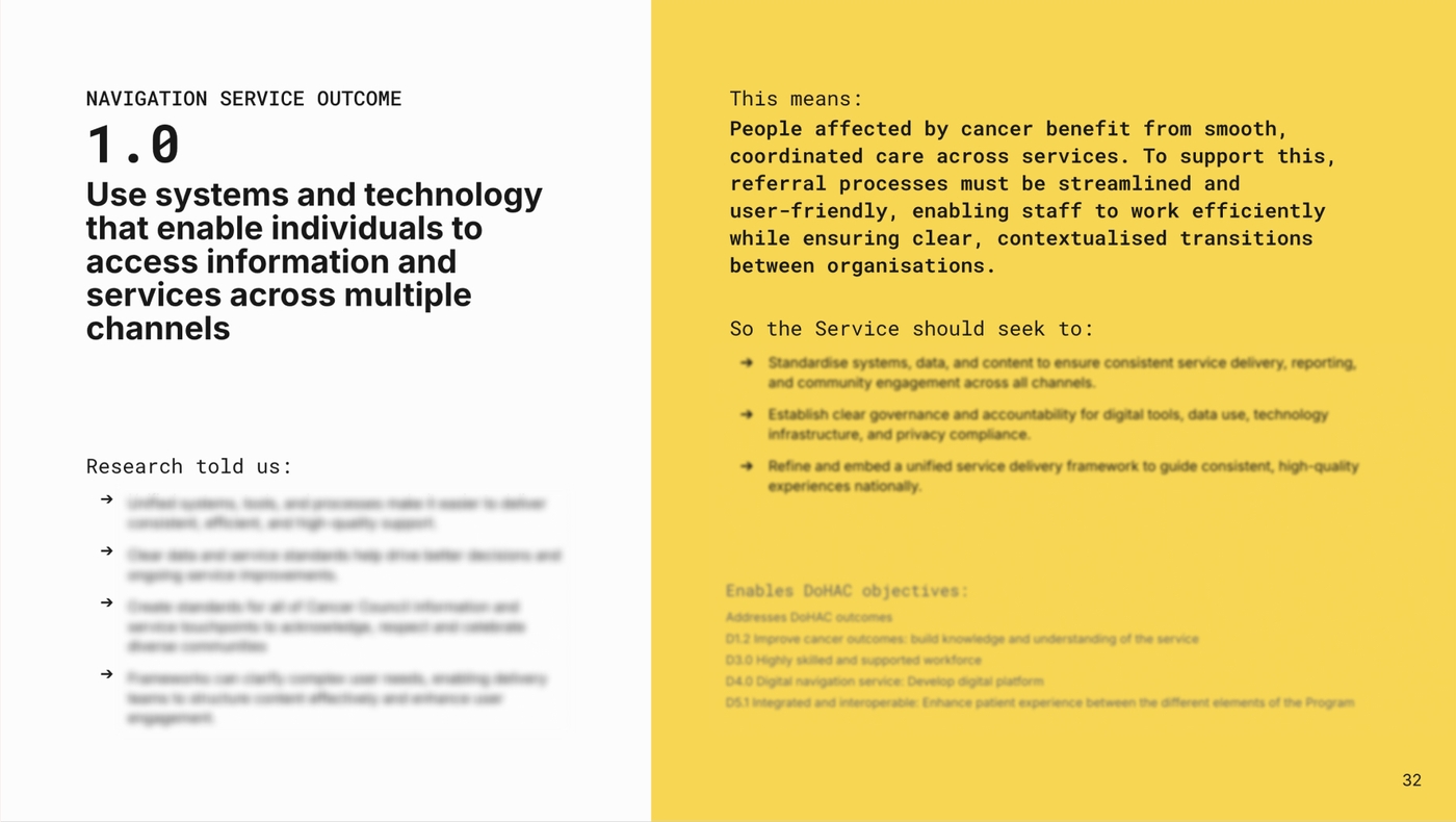 The artefacts lay the groundwork for a more coordinated, intuitive, and supportive service experience for people affected by cancer. By mapping out critical navigation touch points and required change initiatives, the work directly supports the detailed design and development of a service that is more responsive to the emotional, informational, and logistical needs of patients, carers, and families that will be completed in the next phase of the program.