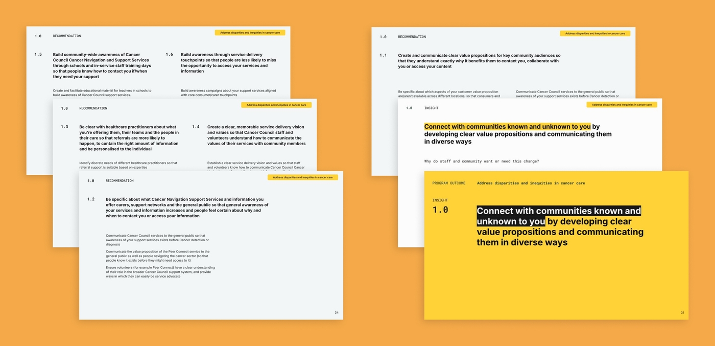 Together, these engagements produced ten strategic recommendations: four focused on Cancer Council’s internal alignment and six designed for joint refinement with ACNNP partners. Each was supported by clear rationale, insights and actions, creating a practical roadmap for sustained, collaborative delivery.