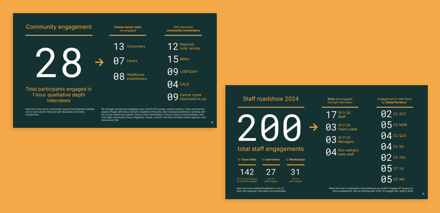 Cancer Council recognised the opportunity to change that. Through this national service design engagement, the organisation sought to deeply understand the lived experience of people impacted by cancer, alongside the operational realities of those delivering support across its federated network. The goal was to define a future model for navigation that could unify nine independent Cancer Council organisations under a shared vision, while ensuring equitable access to information, resources, and care nationwide.