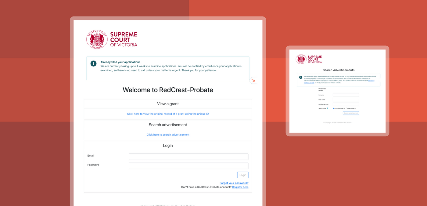 Portable continues to work alongside the Supreme Court of Victoria and Court Services Victoria to support the probate system and uphold our shared commitment to accessible, efficient, and future-ready legal services. Due to the confidence Court Services Victoria now has, the Portable team now also supports the RedCrest-Search system that enables users to perform litigation and court file searches of Supreme Court of Victoria proceedings through a secure process.